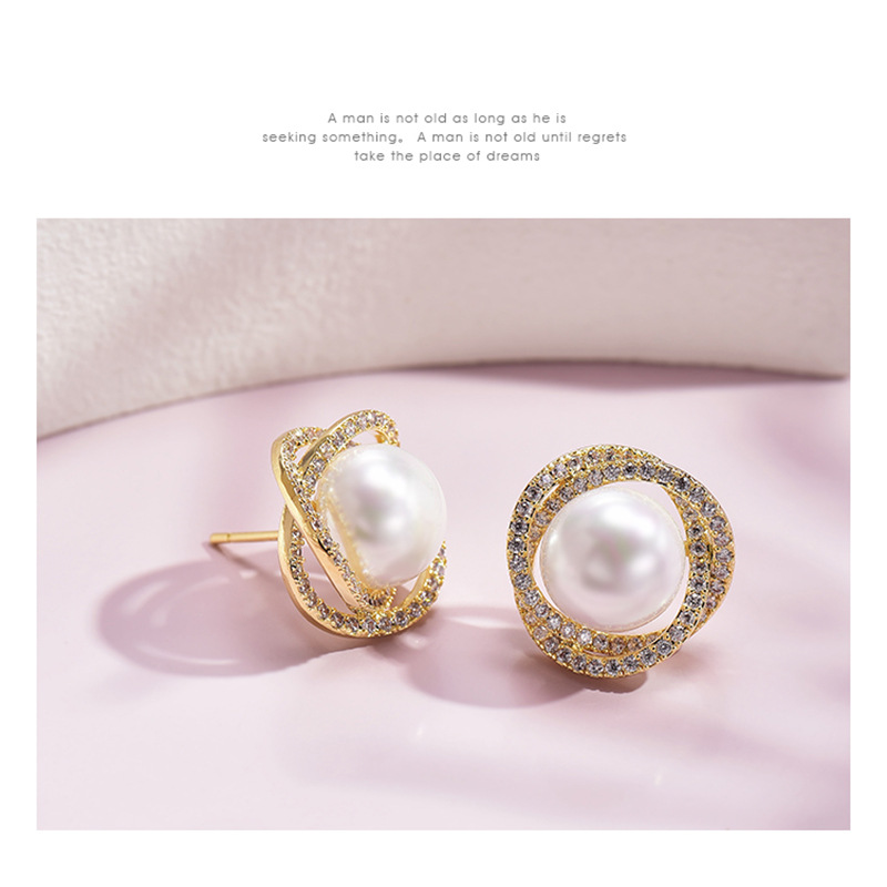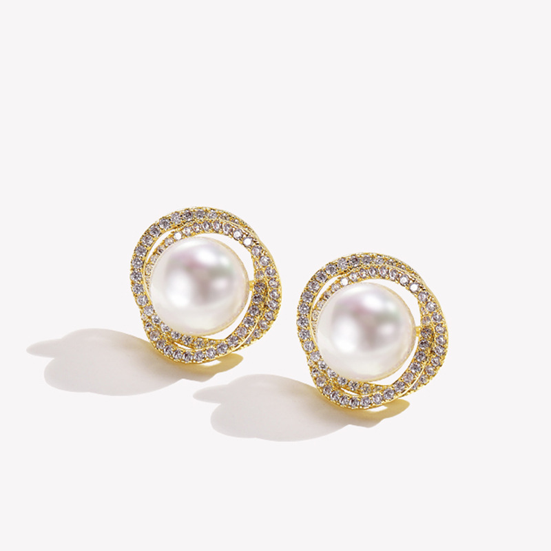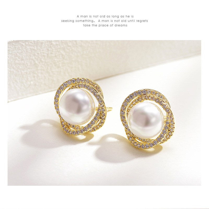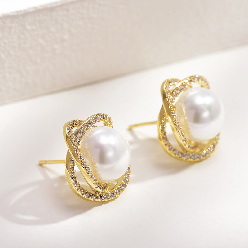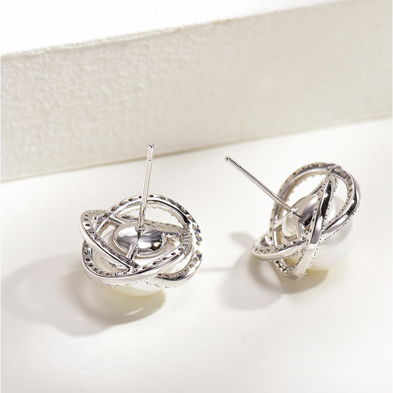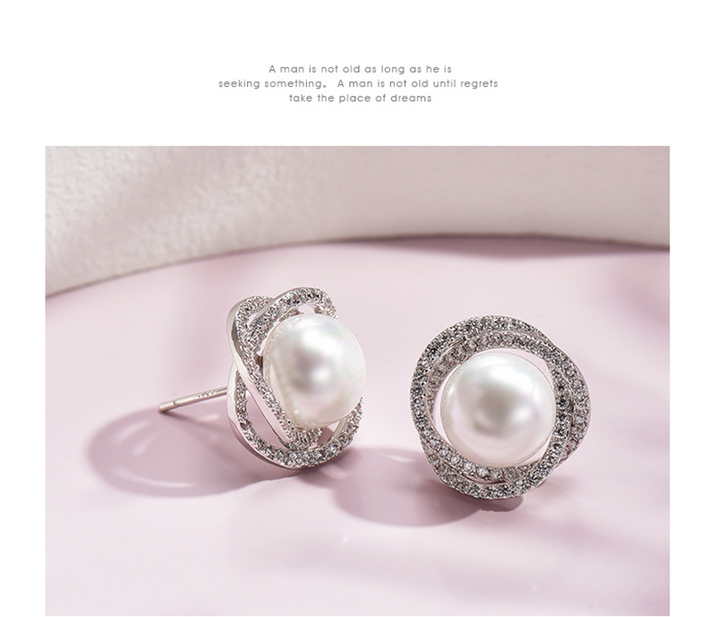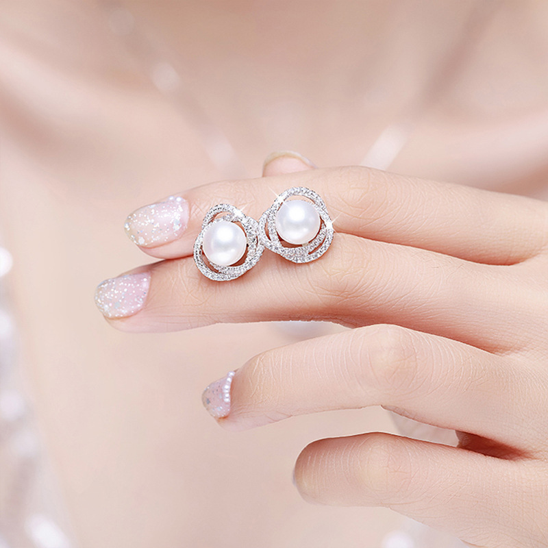 Diamond Rose Pearl Stud Earrings All-match Silver Needle Inlaid With Rhinestone